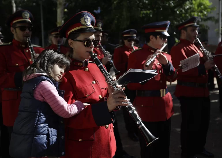 A four-year old girl hugs her mother who is playing the clarinet with the Athens municipality's philharmonic band, outside the law school building. (November 10, 2016)