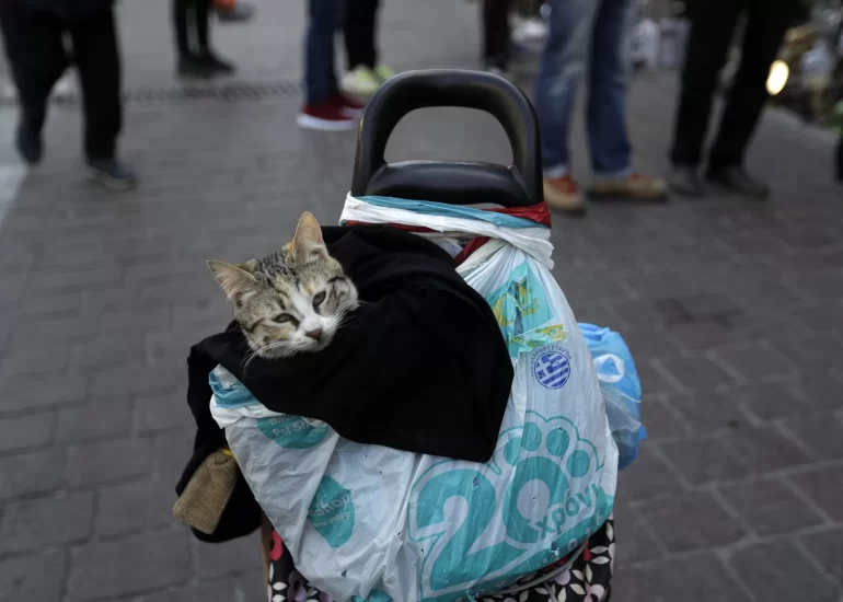 A cat is carried in a bag covered with a small blanket hanging from a shopping trolley while its owner buys goods at Varvakios market in Athens. (February 16, 2017)