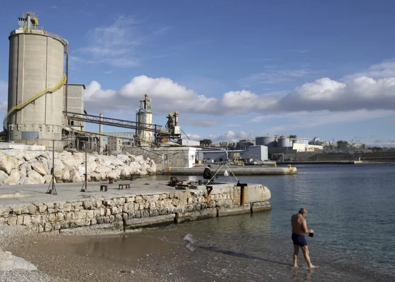 A bather prepares to swim as man fishes in the background, in front of a cement factory, at the Piraeus' port suburb of Drapetsona, near Athens. (January 23, 2018)