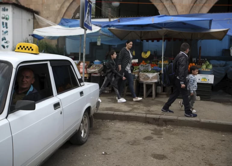 A taxi driver waits in his car at the market area of Idjevan town, northern Armenia. (May 6, 2018)