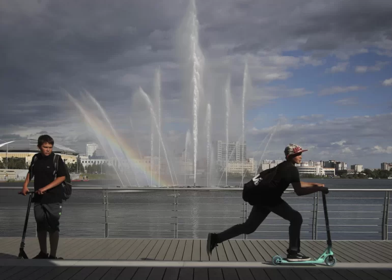 Children ride their scooters on the banks of Kazanka river during the 2018 soccer World Cup in Kazan, Russia. (June 21, 2018)