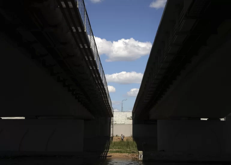 A fisherman walks along the banks of the Volga river during the 2018 soccer World Cup in Kazan, Russia. (June 29, 2018)