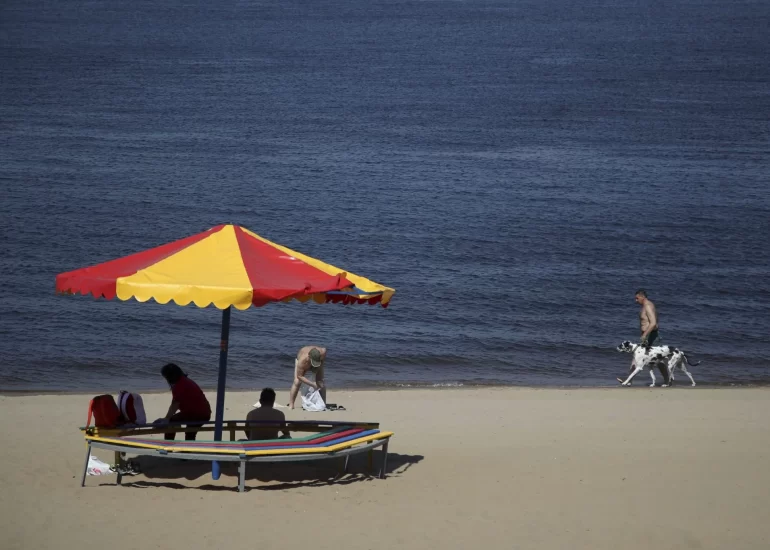A man walks with his dog as people spend a sunny day on a riverfront beach, during the 2018 soccer World Cup in Samara, Russia. (June 3, 2018)