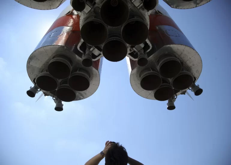 A tourist takes a photograph of a real Vostok rocket outside the Space Museum during the 2018 soccer World Cup in Samara, Russia. (July 8, 2018)