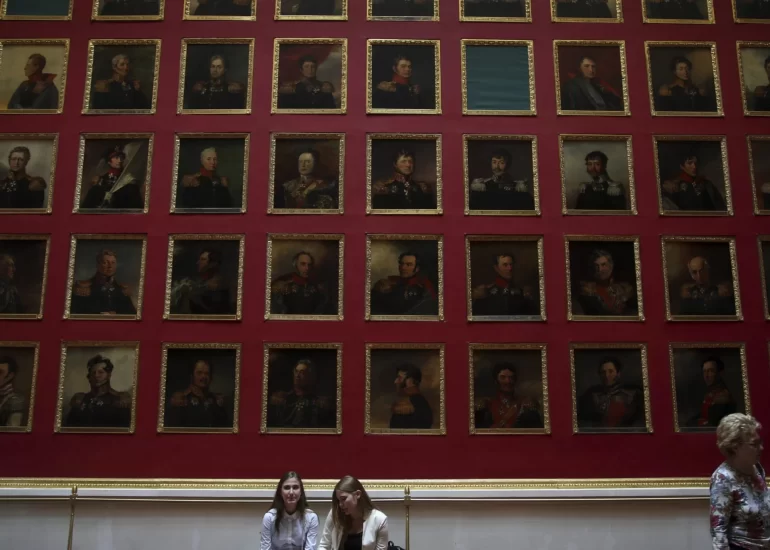 Visitors sit under paintings at the State Hermitage museum during the 2018 soccer World Cup in St. Petersburg, Russia. (July 10, 2018)