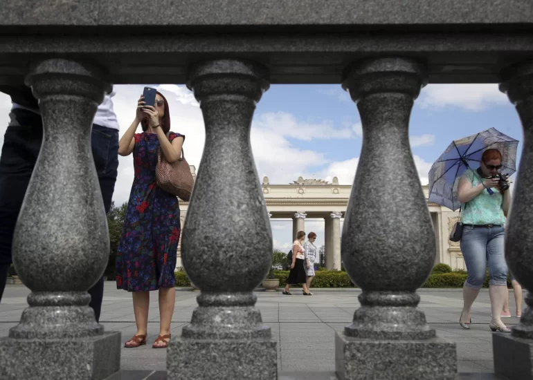Visitors take photographs as two women enter the Gorky Park during the 2018 soccer World Cup in Moscow, Russia. (July 13, 2018)