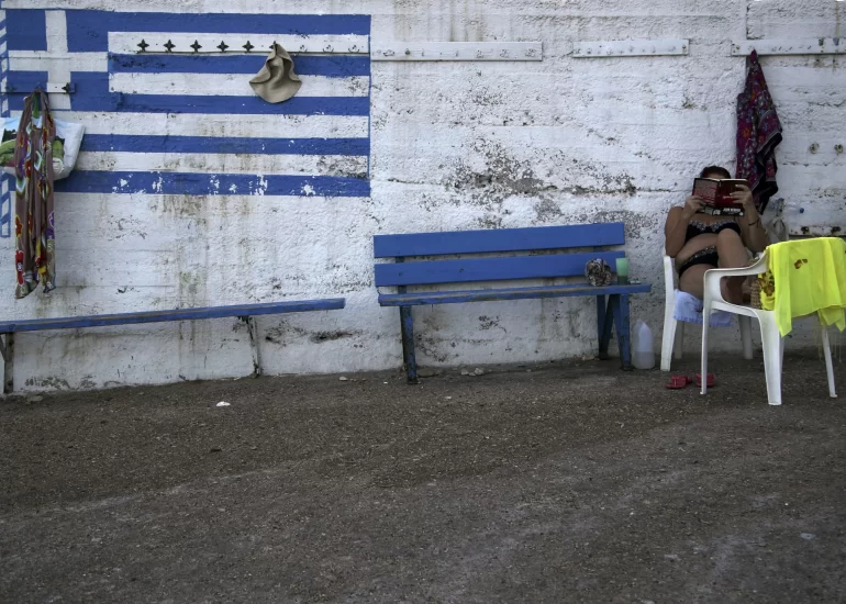 A Greek flag is painted on a wall as a woman reads a book at a small beach in the port of Piraeus, near Athens. (September 4, 2018)