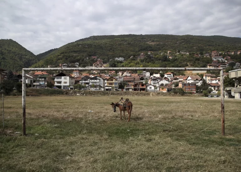 A mule is tethered to a goal-post on an abandoned soccer pitch, in the northern town of Tetovo, FYR Macedonia, on Saturday, (September 29, 2018)