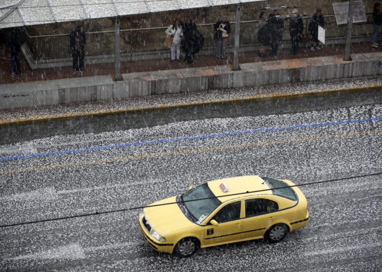 Passers-by take cover under a roof protecting ancient ruins during a sudden spring hailstorm in central Athens. (April 15, 2019)