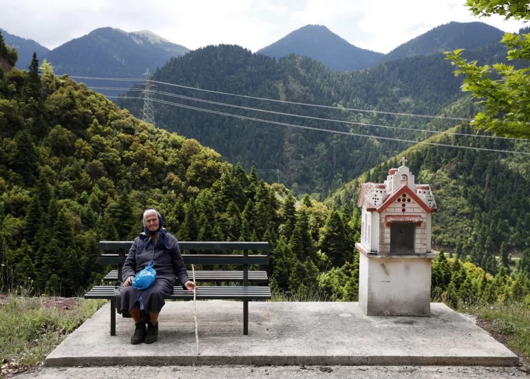 Alexandra Triantafyllopoulou, 91, sits on a bench in the village of Kalesmeno at Evrytania region, in central Greece. (May 15, 2019)