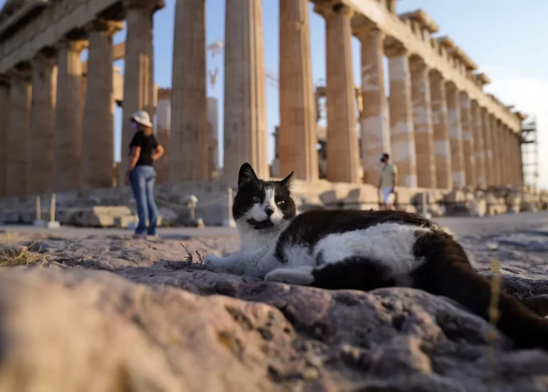 A cat sits in front of the Parthenon temple as tourists walk at the Acropolis hill in Athens, Greece. (June 8, 2021)