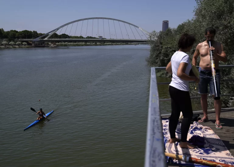 A rower practicing on Guadalquivir river as a man and a woman play music instruments in Seville, Spain. (June 12, 2021)