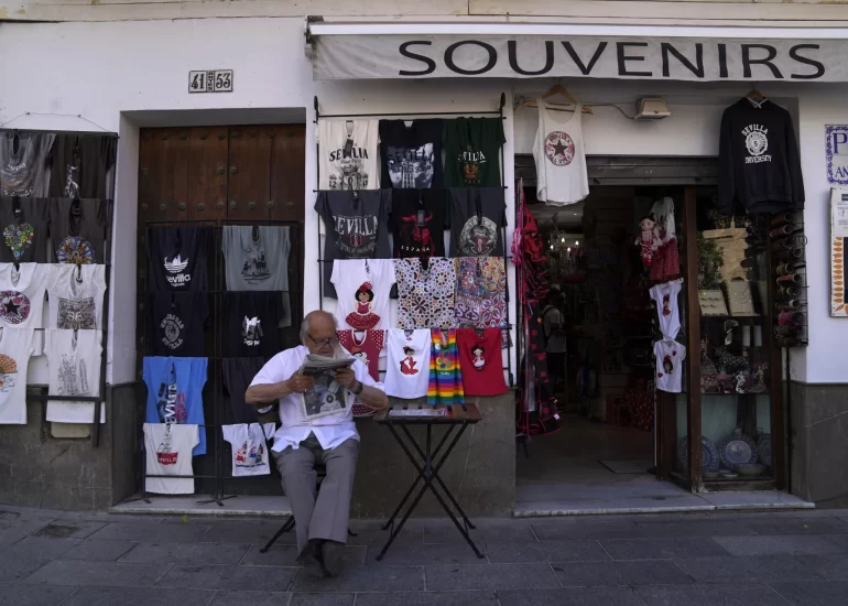 A man reads a newspaper outside a souvenir shop in Seville, Spain. (June 13, 2021)