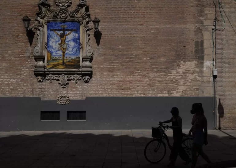 Two women pass in front of a Catholic church in Seville, Spain. (June 13, 2021)