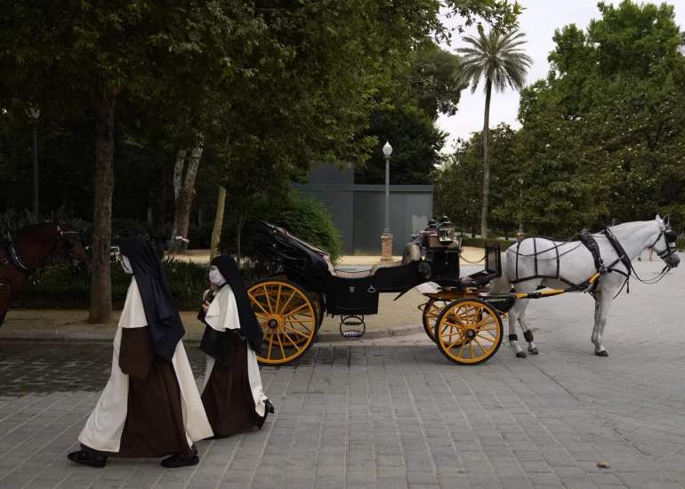 Two catholic nuns walk in front of a tourist horse carriage at Plaza de Espana, one of the most famous landmark in Seville, Spain. (June 15, 2021)