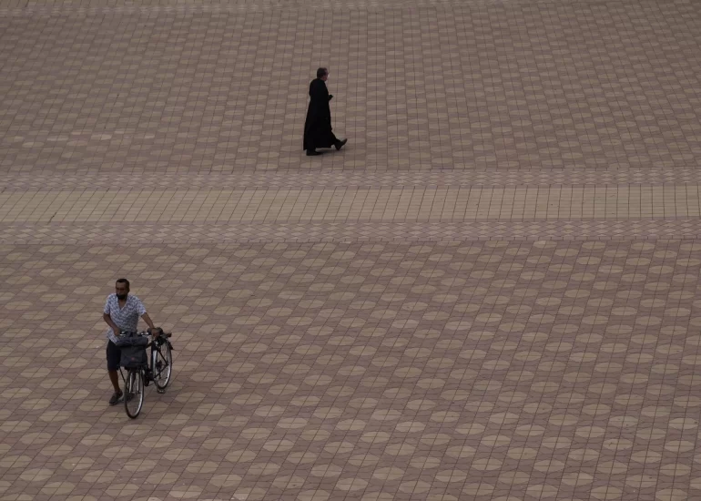 A man pushes his bicycle as a Catholic priest walks at Plaza de Espana, one of the most famous landmark in Seville, Spain. (June 15, 2021)