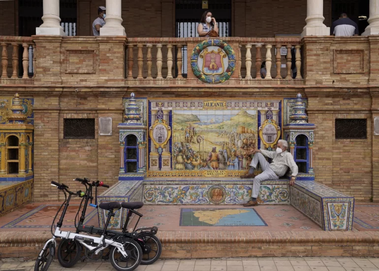A man sits at Plaza de Espana, one of the most famous landmark in Seville, Spain. (June 15, 2021)