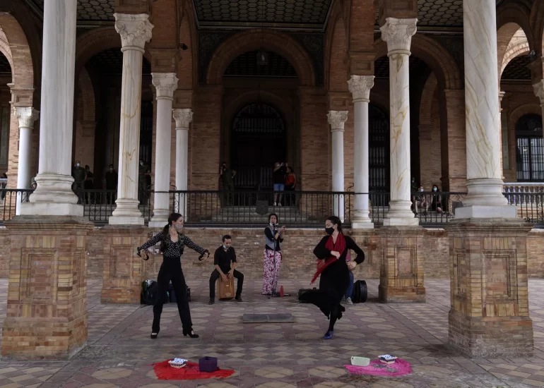 Flamenco dancers perform for the visitors at Plaza de Espana, one of the most famous landmark in Seville, Spain. (June 15, 2021)