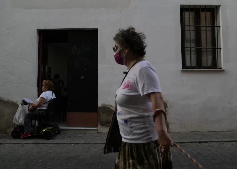 A woman on an electric wheelchair takes part at the christian choir of Santa Anna Triana Catholic church as a pedestrian passes by in Seville, Spain. (June 16, 2021)
