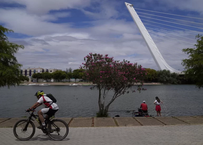 A man rides his bicycle as another one fishes at Guadalquivir river in Seville, Spain. (June 20, 2021)