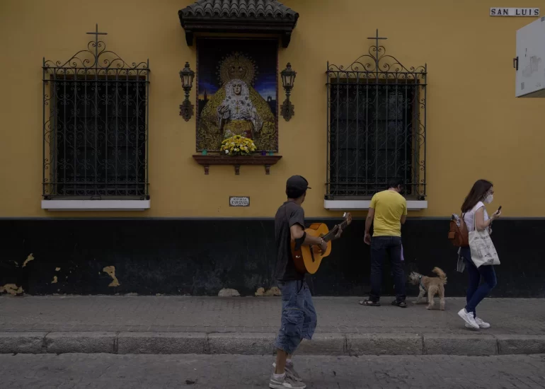 A man plays his guitar as another one walks his dog outside the Virgin of Hope of Macarena Catholic Church in Seville, Spain. (June 21, 2021)