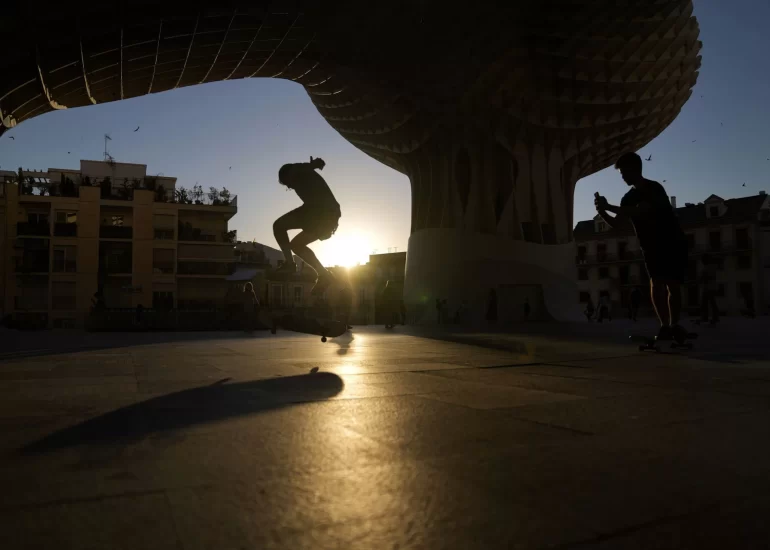 A boy jumps with his skateboard as his friend records him with a cellphone at the Metropol Parasol in Seville, Spain. The Metropol Parasol by Jurgen Mayer H. Architects claims to be the world's largest wooden structure. (June 24, 2021)