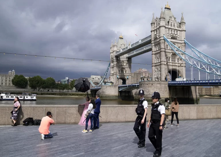 Policemen patrol near Tower Bridge as a bride is photographed on the bank of Thames river in London, Britain. (July 3, 2021)