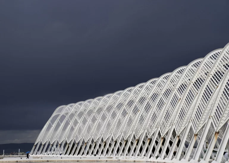 A man holding an umbrella walks at the modern Agora walkway at the main Olympic complex as a rainstorm approaches Athens, Greece. (October 14, 2021)