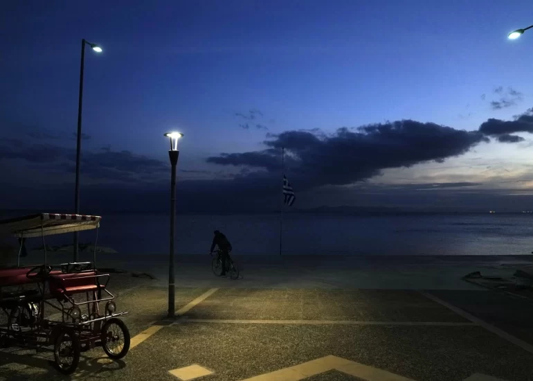 A man rides his bicycle after sunset at the Athens southern coastal suburb of Paleo Faliro, Greece. (October 26, 2021)