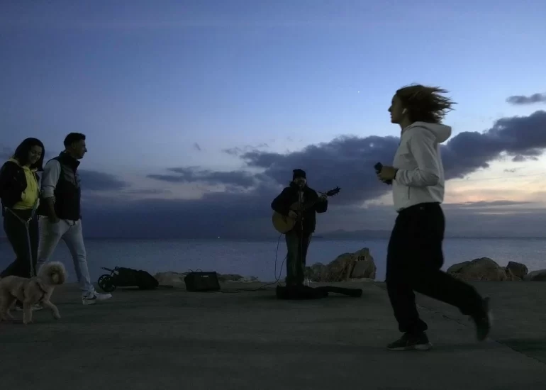 People enjoy a walk and run after sunset, as a musician plays his guitar at the Athens southern coastal suburb of Paleo Faliro, Greece. (October 26, 2021)