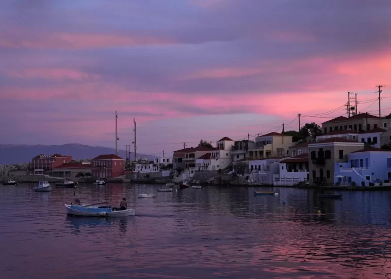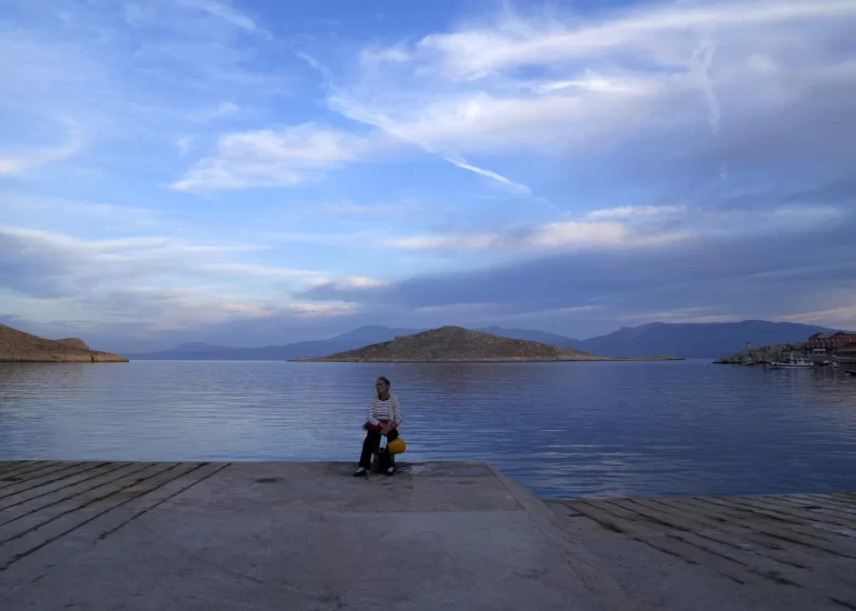 A woman sits at the port of the tiny Aegean island of Chalki, southeastern Greece. (November 5, 2021)