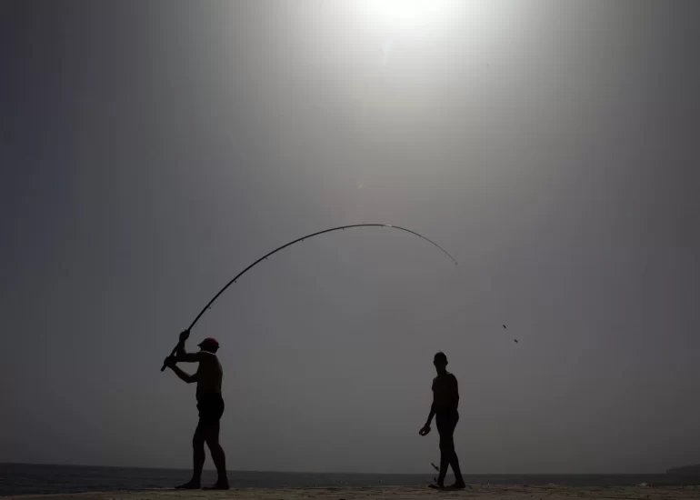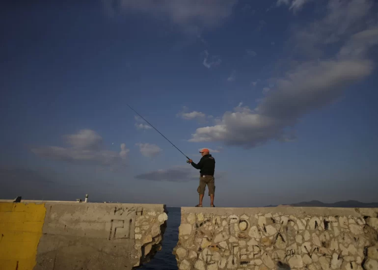 Beachgoers fish from a concrete platform next to the popular beach of Paleo Faliro in southern Athens. (May 20, 2013)