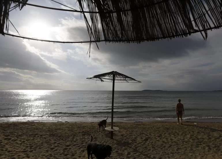 A woman goes for swim as stray dogs walk on the beach of Kavouri, in southern Athens. (March 5, 2015)
