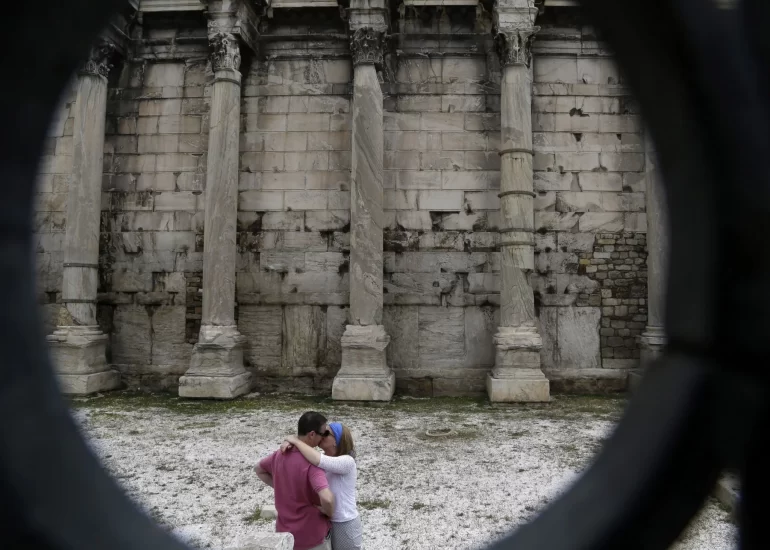 A couple kiss, at the ancient site of Hadrian Library in Athens. (May 12, 2014)