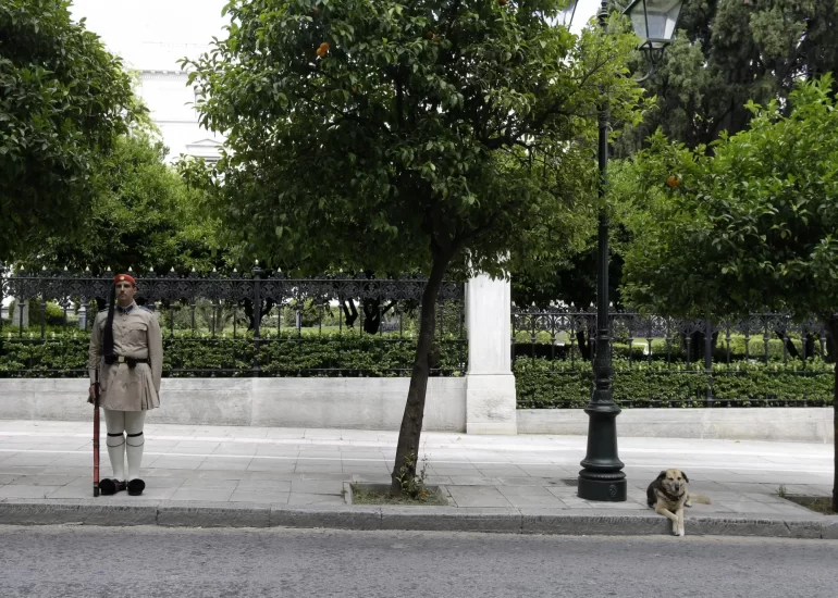 Greek Presidential Guard, Evzonas, stand guard as a stray dog sits on the sidewalk outside Presidential Palace in Athens. (June 8, 2015)