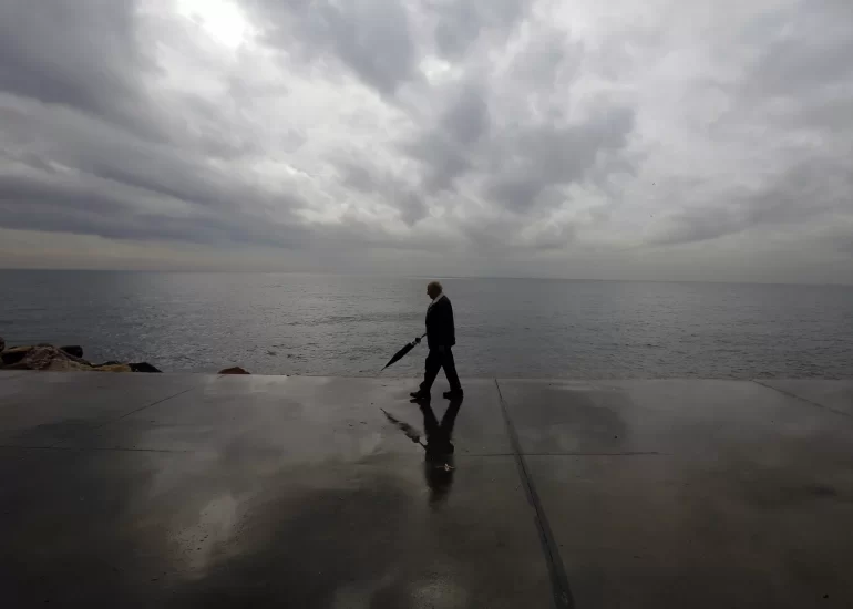 A elderly man enjoys a walk by the cloudy Paleo Faliro beach in southern Athens, (January 28, 2014)
