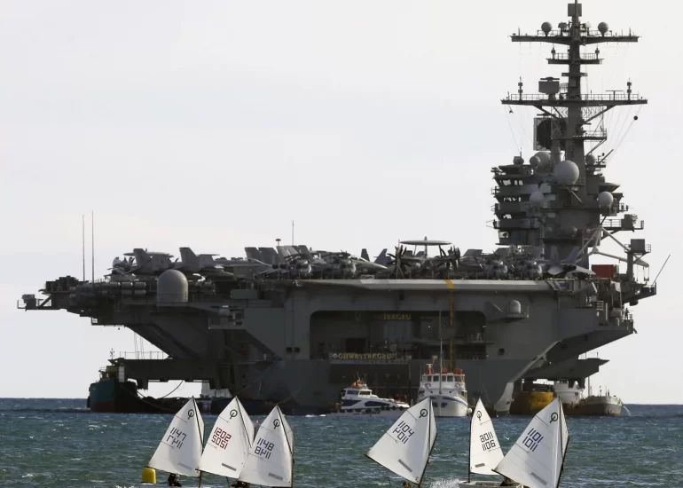 People train in sail boats in the waters of the Saronic Gulf, outside Piraeus port, near Athens, Greece, back dropped by the U.S. nuclear powered aircraft carrier USS George H.W. Bush. (March 5, 2014)