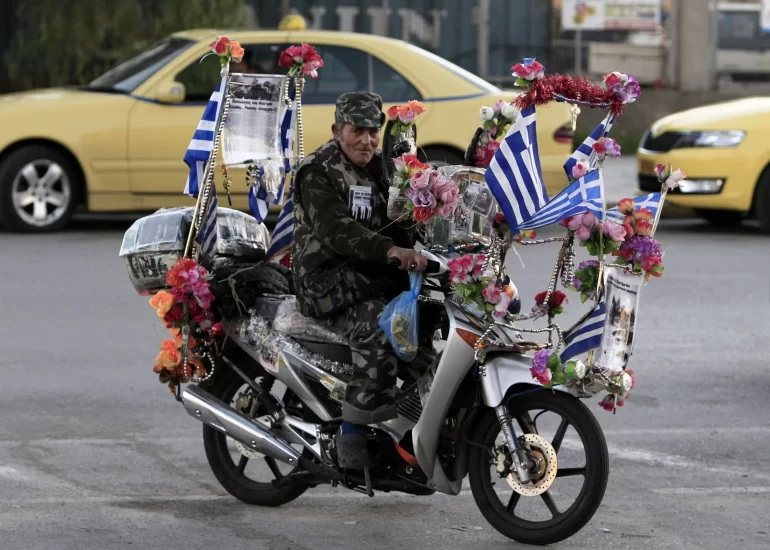 Retired dock worker Dimitris, 82, drives a scooter decorated with flowers, Greek flags and newspaper clippings in the depressed Perama area, on the fringes of Athens' port of Piraeus. (February 10, 2014)
