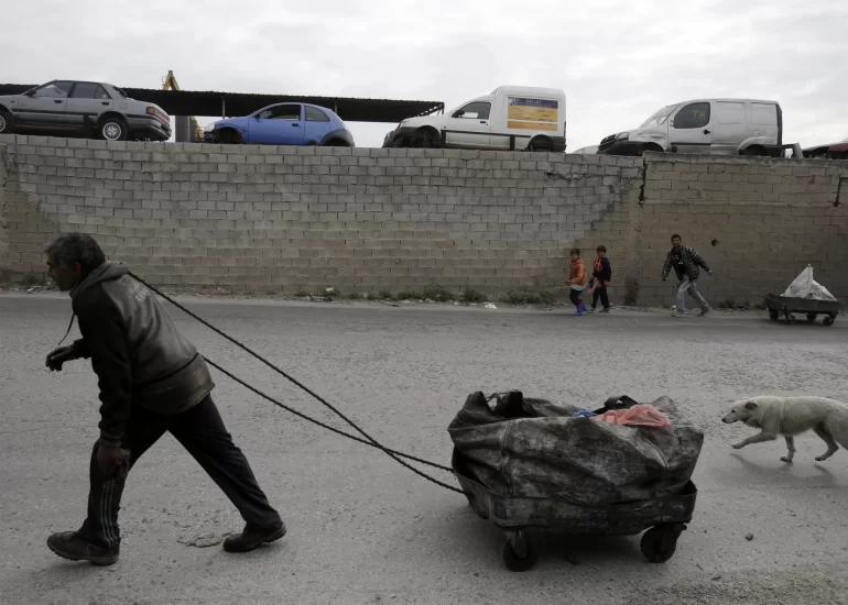 An Asian immigrant pulls an improvised cart filled with metal scavenged from rubbish bins which he then sells for recycling, in the Aspropyrgos industrial area, western Athens. (February 5, 2014)