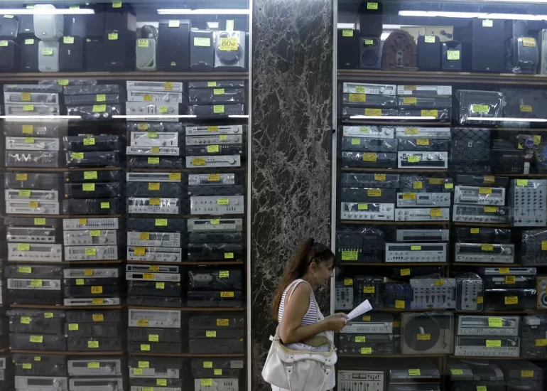 A woman reads a paper in front of a shop selling old stereo systems in Athens. (July 21, 2015)