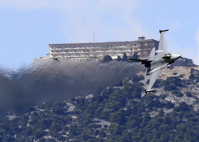 A Dutch F16 fighter jet takes part in an aerobatic display as the pilot flies in front of Casino Mont Parnes atop of the mountain Parnitha during an air show in northern Athens. (September 26, 2014)