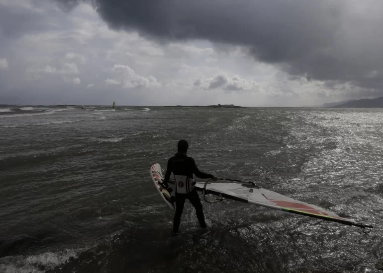 A windsurfer goes for practice in the coastal town of Artemida, east of Athens. (February 10, 2015)