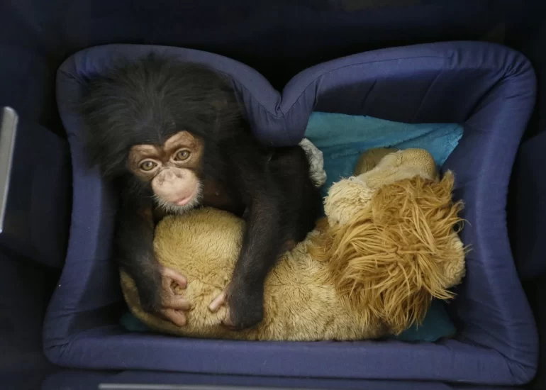Baby chimpanzee Jason sits on his sleeping box at the Attica Zoological Park in Spata, east of Athens. (November 13, 2015)