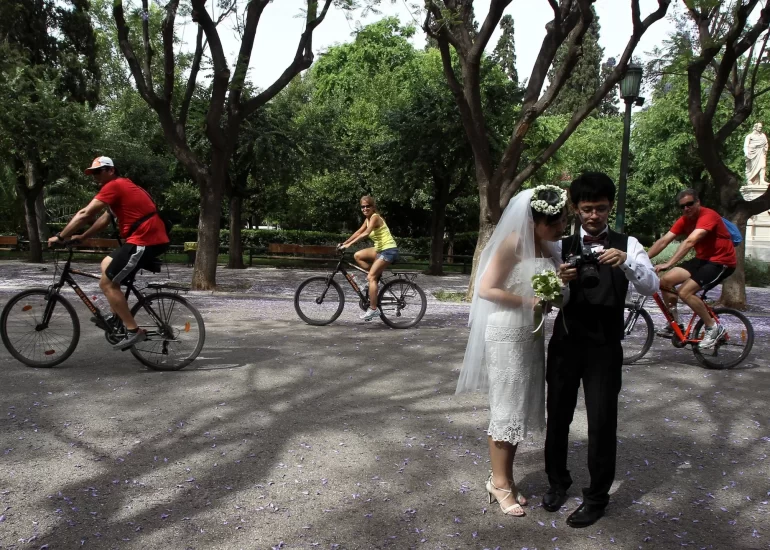 A couple from China on their honeymoon, the groom Peng Yuan, 31, and the bride Carolyn Zhang, 27, review their photographs in the camera, as tourists pass with bicycles at Zappeio Park in Athens. (May 22, 2013)