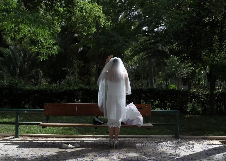 Carolyn Zhang, 27, a bride from China prepares for a photo-shoot with her new husband Peng Yuan, unseen, during their honeymoon in Greece at Zappeio Park in Athens. (May 22, 2013)