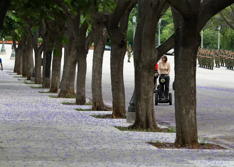 A tourist enjoys a ride with a segway in Zappeio park with purple leaves on the ground as the Presidential Guard, background, practice a drill in Athens. (May 16, 2013)