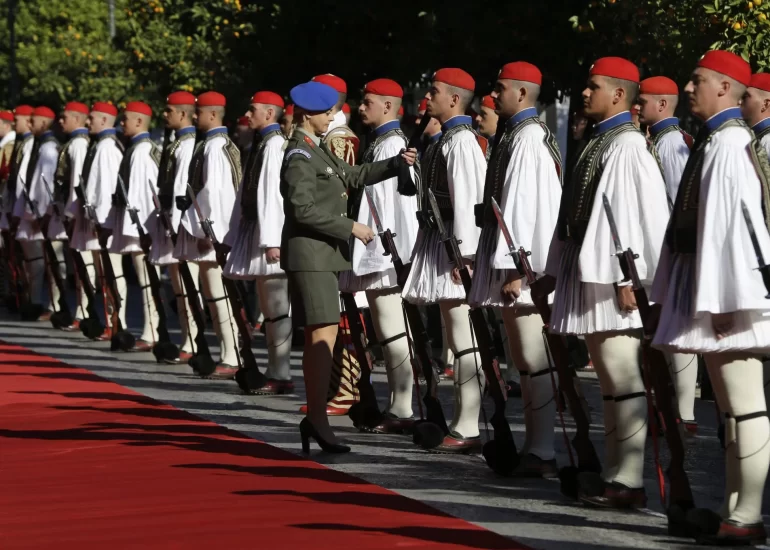 A Greek Presidential Guard officer inspects the evzones prior to the official welcome ceremony for Turkey's President Recep Tayyip Erdogan, in Athens. (December 7, 2017)