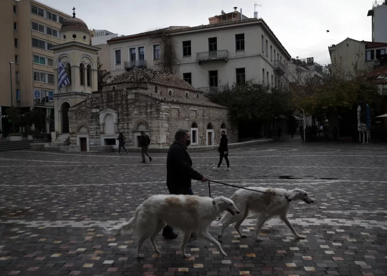 A man wearing a face mask walks his dogs at Monastiraki square in central Athens, Greece. (January 26, 2021)