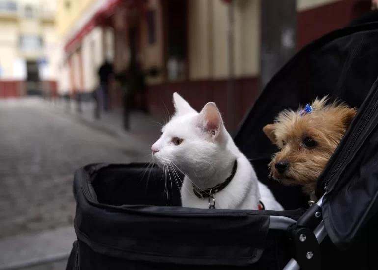 A cat and a dog sit inside a baby stroller in Seville, Spain. (June 19, 2021)