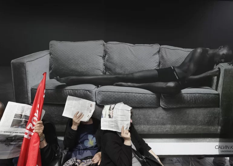 Elderly protesters shield their face from the sun with newspapers as they sit infront of a billboard in Athens. (May 1, 2017)